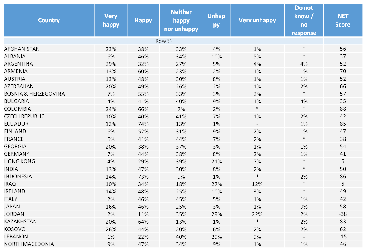 Colombia came first in terms of happiness, with a net index (88), followed by Indonesia (86), Ecuador (85), Kazakhstan (83), and the Philippines (78). Jordan population was the least happy with a net score of (-38) on the index, followed by Lebanon (-15), then Syria (-7), and Iraq and Hong Kong, both of which scored (5). (See table below)