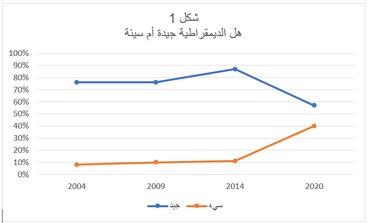 فطبقاً لاستطلاع مسح القيم العالمي world values survey الذي يجرى كل 4 أو 6 سنوات في كثير من دول العالم ومنها العراق فإن خيار الديمقراطية لم يعد هو المفضل لديهم[5]. يوضح الشكل 1 أدناه كيف تغير المزاج العراقي نحو الديمقراطية بعد 2003؛ فبعد أن كان 71% من العراقيين يعدون الديمقراطية شيئاً جيداً عام 2004 واستمروا بالتأييد نفس لها عام 2009 حتى بلغوا ذروة التأييد للنظام الديمقراطي عام 2014 وقبل احتلال “داعش” لجزء من الأراضي العراقية، فإن الحال تغير بشدة بعد ذلك لتنخفض نسبة من قالوا أنها جيدة إلى 57% فقط عام 2019 [6].