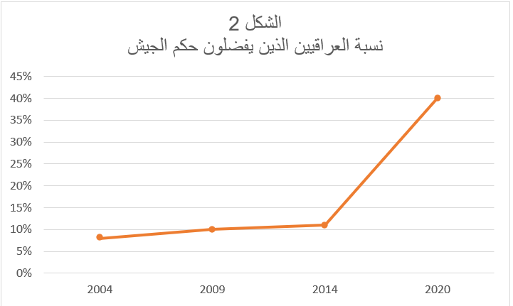 ويمكن أن تشير هذه اللامبالاة بالتصويت إلى مشكلة أكبر بكثير، إذ يبدو أن العديد من العراقيين قد ينقلبون ضد نظامهم السياسي، مما يجعلهم عرضة للحلول الراديكالية والعنيفة لمشاكل العراق السياسية[16]. ويبدو هذا الخطر واضحاً في نمو الاتجاه نحو الاستبداد والديكتاتورية بين العراقيين؛ فطبقاً للشكل 2، فإن نسبة العراقيين الذين يفضلون حكم العسكر (الجيش) نمت من 12% فقط عام 2004 لتصل بحدود 50% عام 2020[17].