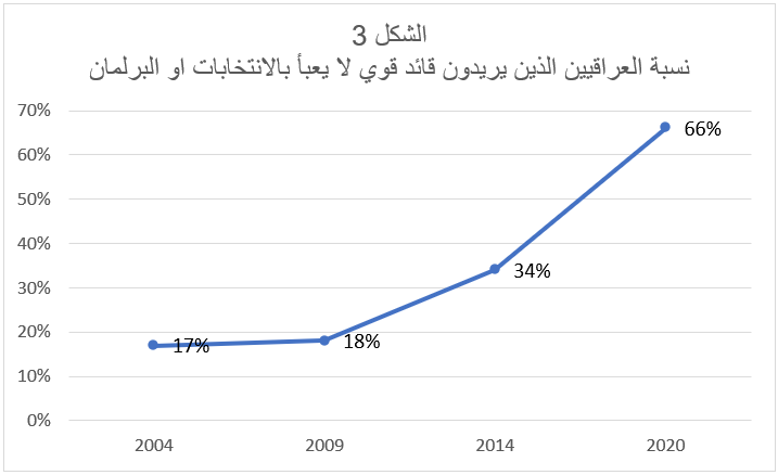 من جانب آخر، فقد نمت نسبة العراقيين الذين يبحثون عن قائد قوي لا يأتي من خلال الانتخابات أو البرلمان، ليحكمهم من 17% فقط عام 2004 إلى 76% عام 2020 كما يوضح ذلك الشكل 3[18].