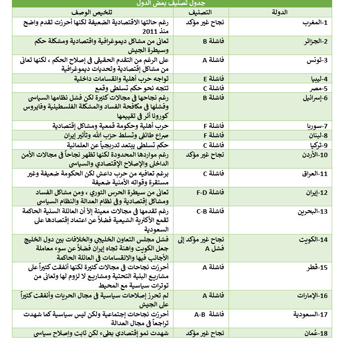 وفقاً لهذا التقييم فإن الدول صنفت إلى ناجحة وفاشلة ، وكانت هناك أربع مستويات للنجاح والفشل (A,B,C,D ) بحسب المعايير المعتمدة ، لقد آن الأوان لنعتمد تقييماً لا يعتمد على التهديدات المباشرة للإرهاب والتطرف والسياسات المتشددة في المنطقة. فالمشكلة على ما يبدو أبعد من ذلك فقط وتمتد لتشمل المعدلات الوطنية للتقدم في المجالات الإقتصادية والحقوق المدنية مثل (الناتج المحلي الإجمالي مقوماً بالقوة الشرائية الحقيقية PPP ، معدل التحضر Urbanization ، والتغيرات في أسعار السوق ، ومعدلات الفساد ، وضعف توزيع الثروة بين المواطنين ، والإنفاق على التسلح ، والمشاكل الديمغرافية).