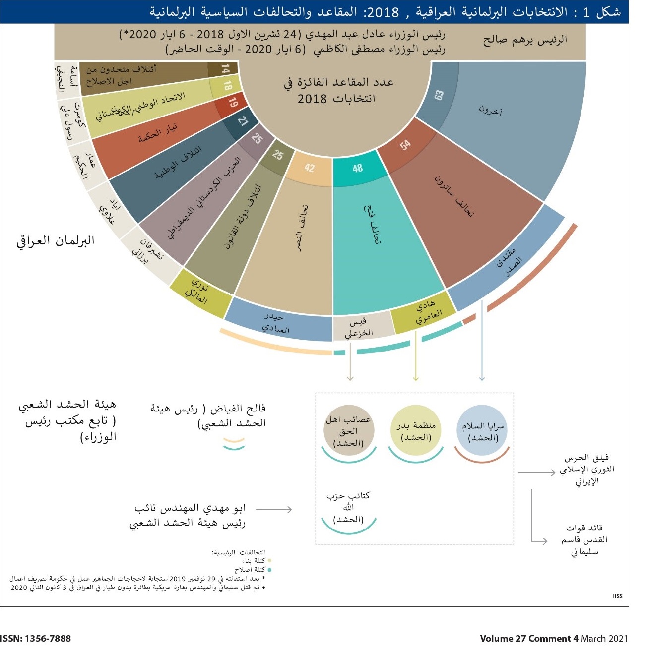 ثم حذر احد زعماء التيار الصدري (حكيم الزاملي)من أنه إذا انتقلت رئاسة الوزراء المقبلة إلى حزب منافس ، فإن ذلك سيثبت أن الانتخابات كانت مزورة. و يبدو أن الصدر ، الذي اشتهر بأنه لا يمكن التنبؤ به ، يرسل إشارات مختلفة: أولاً ، إلى المنافسين الذين يعتبرهم أقوياء عسكريًا وسياسيًا ، وكذلك الى الكاظمي ، تتضمن بأن دعمه ضروري لنجاح رئيس الوزراء. كما ترسل مواقفه المتشددة إشارات ثقة في فوز إنتخابي. و قد يسمحون له أيضًا بالمطالبة بتنازلات أكبر من الشركاء المحتملين إذا إضطر الى تشكيل تحالف مع كتلة أخرى. و “فتح” ، التحالف السياسي الذي يمثل وحدات الحشد الشعبي (انظر الجدول 1) ، سيكون الأكثر خسارة في الانتخابات المقبلة. بينما كان قد فاز بثاني أكبر كتلة في البرلمان في عام 2018 (انظر الشكل 1) ، معتليا موجة من الدعم الشعبي بعد أن ساعد في هزيمة تنظيم الدولة الإسلامية ، المعروف أيضًا باسم داعش : الدولة الإسلامية في العراق والشام. لكن الصورة الشعبية لفتح تضررت بعد تعرض وحدات الحشد الشعبي لانتقادات بسبب مساعدتها قوات أمن الدولة في قمع احتجاجات 2019. وتشتت قيادتها في أعقاب مقتل المهندس خشية أن يكونوا الهدف التالي. منذ ذلك الحين ، أعادت فتح تنظيم نفسها على أمل جذب المزيد من الأصوات في الانتخابات المقبلة ، لا سيما من خلال إنشاء فروع جديدة للشباب تهدف إلى كسب ناخبين يصوتون لأول مرة.