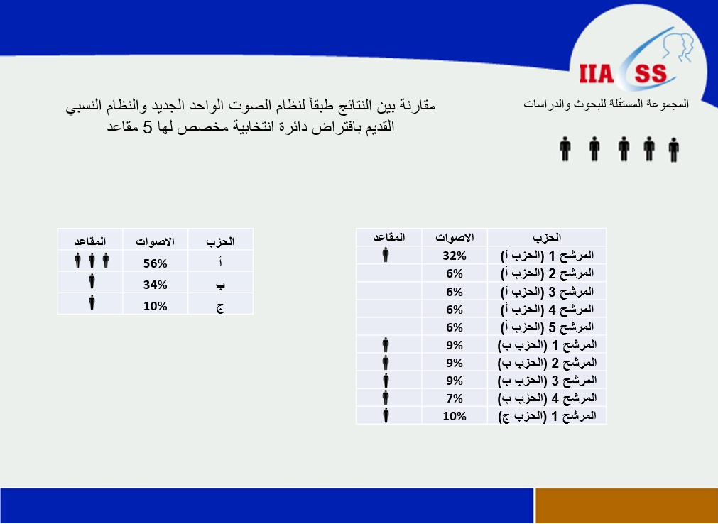 من جانب آخر فأن هناك خاصيتان مهمتان ينبغي فهمهما من قبل كل من يريد أستخدام هذا النظام بأمثل طريقة. الأولى تتعلق بكيفية أحتساب الفائز. والثانية تتعلق بكيفية رسم الدوائر. فهذا النظام يرتب الفائزين على وفق ما يسمى بعلم المقاييس بالمقياس الرتبي Ordinal scale بمعنى انه يرتب الفائزين (من الاول الى السادس مثلاً) بحسب الاصوات التي حصلوا عليها وبغض النظرعن حجم ونسبة تلك الاصوات.لاحظوا المثال التوضيحي أدناه. ففي الدائرة الانتخابية س مثلاً والمخصص لها 5 مقاعد أنتخابية يحصل الحزب ب الذي أحرز 34% فقط من الأصوات على 3 مقاعد في حين حصل الحزب أ الذي حصد54% من أصوات الدائرة الأنتخابية على مقعد واحد فقط مثله مثل الحزب ج الذي حصل على 10% فقط من مجموع الأصوات!! في حين لو أستخدمنا النظام النسبي الذي سبق أستخدامه في العراق لكانت النتيجة كما تبدو عليه في الجانب الأيسر من الصورة(3 مقاعد للحزب أ،مقعد واحد للحزبين ب و ج). وهذا ما حصل بالضبط في انتخاباتنا في بعض الدوائر الانتخابية،وسأشرحه بأمثلة من صناديق انتخابات مختلف المناطق في بغداد والجنوب.
